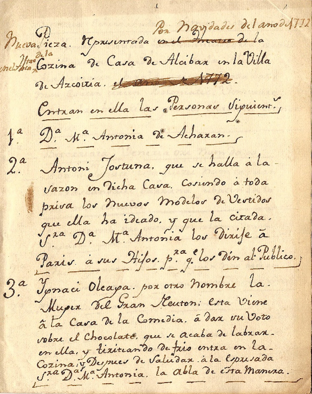 This environment also generated plays written in Basque, of which a few examples have survived, such as the comic opera in Basque and Castilian by Peñaflorida himself, "El borracho burlado" (1764), and his operetta "Gavon sariac". Meanwhile, a 20-page manuscript was discovered recently that contains a short play written by Joaquín de Alcibar, Captain of the Royal Army and Knight of the Order of Carlos III. It is titled "Gran Tourra", in reference to the trips that noblemen of the time used to make to cities in Italy, Austria, Germany, France and England. It includes the brief "Sukaldeko Disparatiak" (Kitchen nonsense), made up of dialogue between three women talking about the Caballeritos de Azkoitia (the founder members of the RSBAP), and which was first performed in 1771. The author also wrote erudite texts, mythology, caricatures and bertsos.